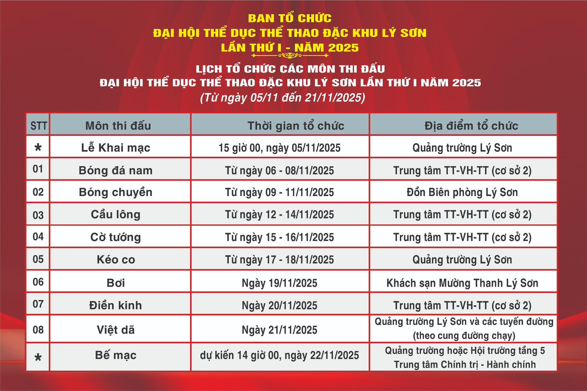 Ban Tổ chức Đại hội Thể dục thể thao đặc khu vừa ban hành Thông báo số 04/TB-BTC ngày 29/10/2025 về nội dung, thời gian tổ chức các môn thi đấu Đại hội Thể dục thể thao đặc khu Lý Sơn lần thứ I năm 2025.